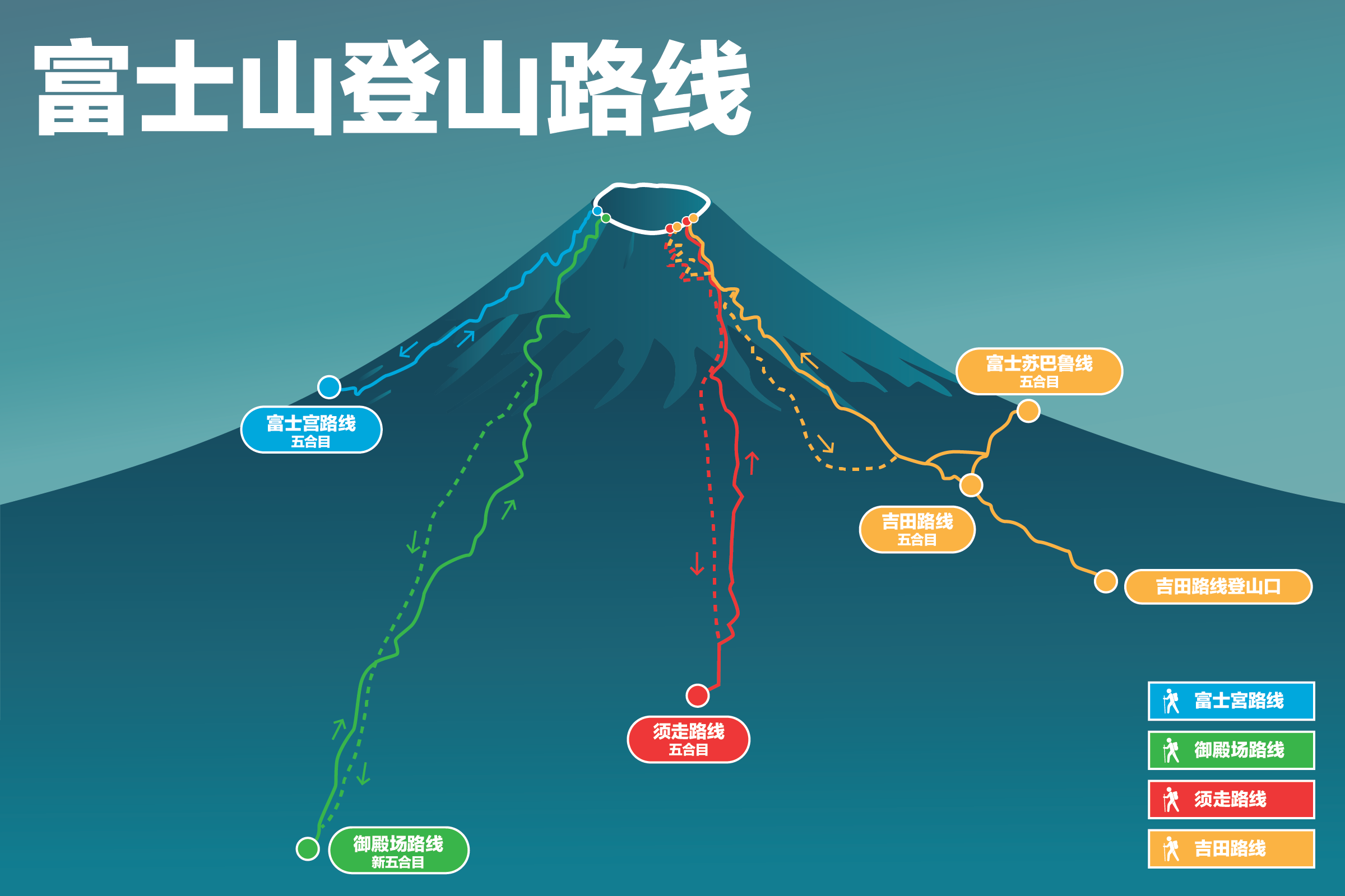 吉田路线: 最热门也最便捷的路线,设施完备且配有独立下山步道,是初学者与追日登山者的理想之选,却时常人潮涌动。