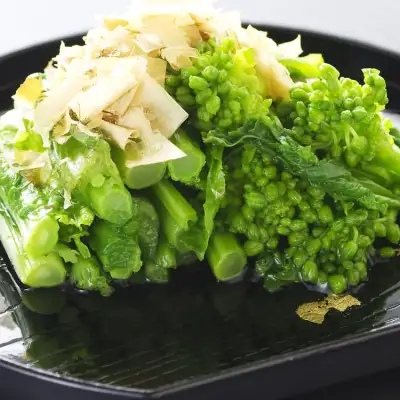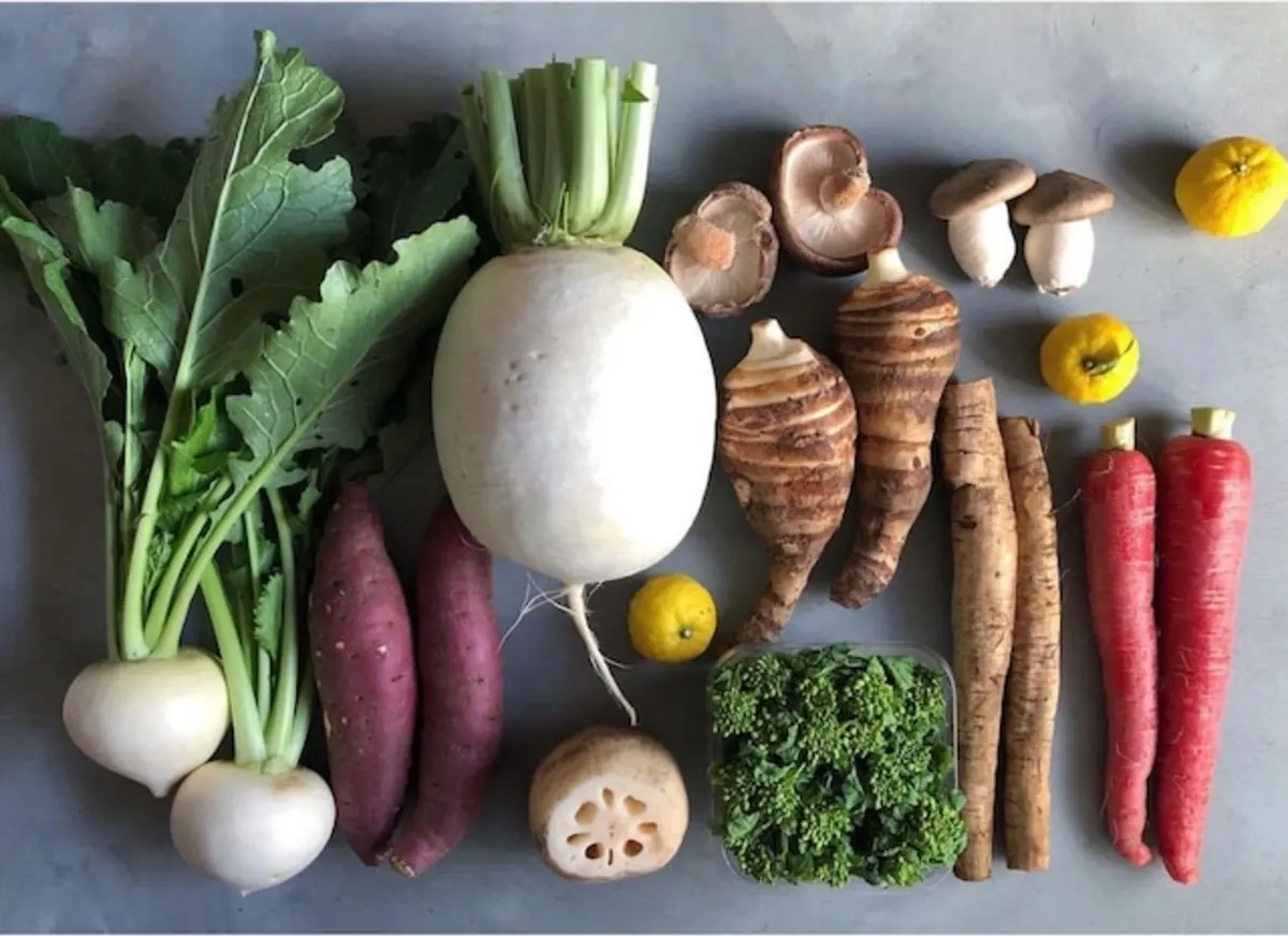 怀石料理的一大特色是“京野菜”(意为“产自京都的蔬菜”),如香甜的金时红胡萝卜、味道偏淡的万愿寺辣椒和富含胡萝卜素的九条葱。几个世纪以来,京都一直根据严格的标准培育这些传统蔬菜,以确保其品质。京野菜形状独特、色彩鲜艳且营养价值很高,受到世界各地厨师的青睐,进而激发了新菜品的创作。