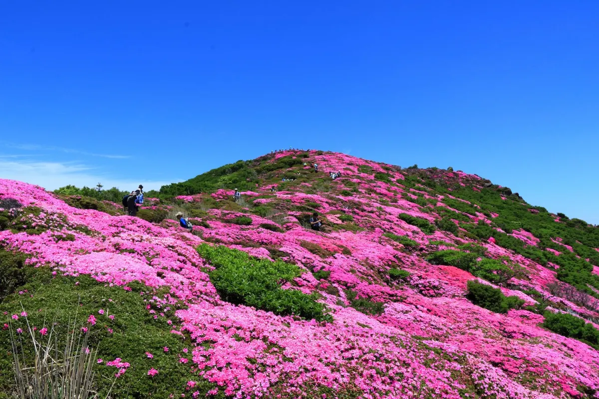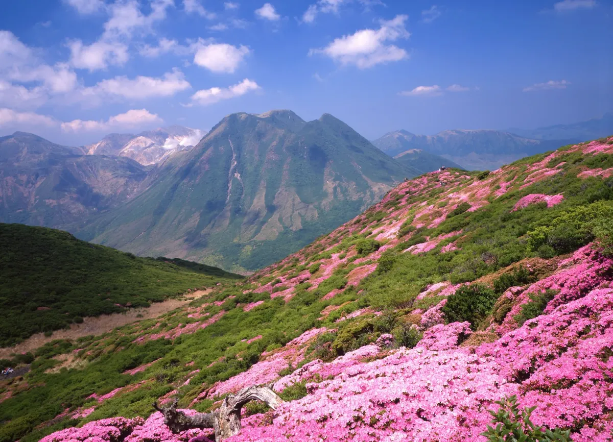 九重山脉地处大分县西部,以其火山峰群、广袤草原和四季变换的色彩而闻名。每年五月中旬至六月中旬,深山雾岛杜鹃花会将连绵山峦染成一片绚烂的粉红。这种花卉为当地原生品种,在火山地貌之中展现出了非凡的生命力。这片花海沿山脊线蔓延开来,形成了日本规模最大的杜鹃花群落之一,已被指定为日本天然纪念物。