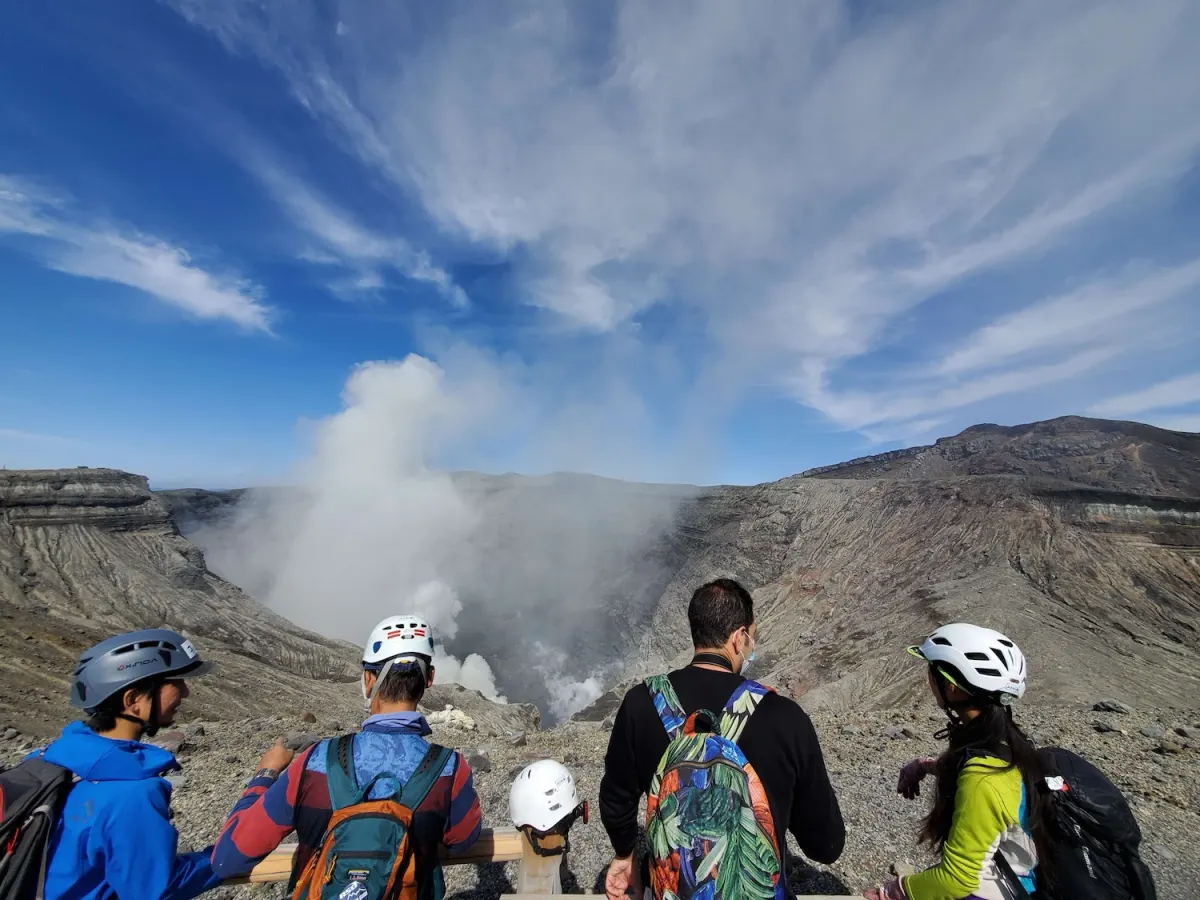 游客可参加导览式徒步,登上海拔 1,506 米的中岳山顶或破火山口内的最高峰——海拔 1,592 米的高岳,进而探索这片火山地带。倾向自由徒步的游客可选择黑岩山和泉水山徒步步道,穿越绵延起伏的草原以及由数百年火山活动塑造出的险峻山脊。