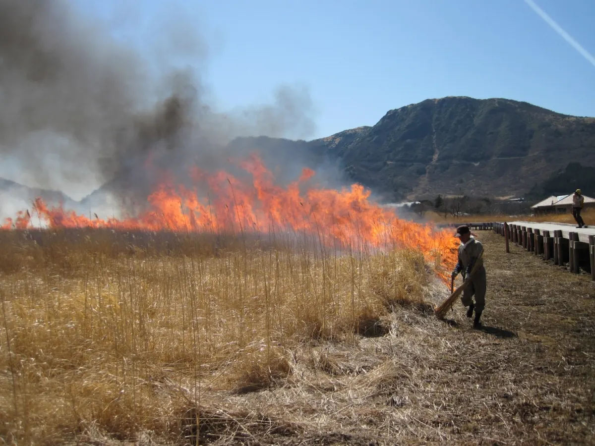为保护草原生态环境,当地每年春季都会开展策略烧除行动(亦称“野烧”),阿苏草原保护活动中心正是该行动的执行基地。当地的土壤研究表明,野烧已在此持续约万年之久。野烧能够促进新草萌发,保护生物多样性,并防止草原被森林侵蚀。每年春季野烧开始前,当地都会举办培训研讨会和筹备会议,每年约有 2,000 名经过培训的志愿者通过阿苏绿色资源基金会 (Aso Green Stock Foundation) 组织的项目参与其中。