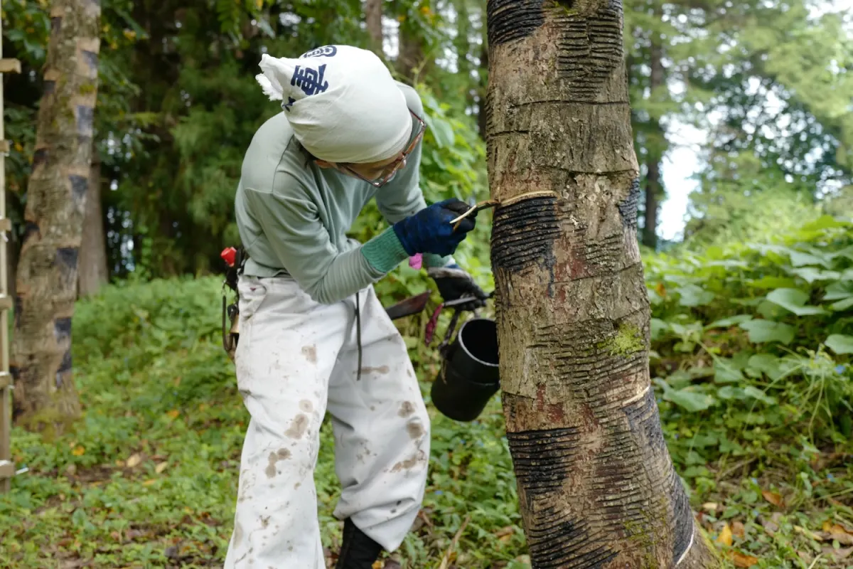 日本国内生产的漆大部分来自岩手县二户市净法寺 的漆树林。采漆是当地世代相传的传统技艺。在气候温暖的月份,漆树汁液的流动最为活跃。这时,熟练的采漆工人会划开树皮,一滴一滴地收集珍贵的漆树液,整个过程缓慢而极耗人力。