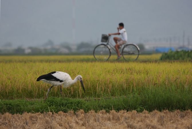丰冈是日本沿海的一座小镇,位于京都西北方约 2.5 小时车程处。丰冈的白鹳是另一个观鸟人士梦寐以求的观赏对象。丰冈投入了大量资源来拯救曾在日本一度灭绝的野生东方白鹳族群。最后一只已知的白鹳于 1971 年在这里死亡。1985 年,日本从俄罗斯引进了一群新的白鹳。该地区种植了大量有机稻米,确保了种植农作物的稻田中含有大量白鹳赖以为生的生物,随后产出的稻米也被称为“鹳天然米”,被视为一种优质农产品。
