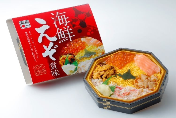 日本北部的北海道是日本一些最著名海鲜的产地。豪华的铁路便当是品尝北海道美食的最佳方式。便当内的寿司醋饭上铺满了北海道鲑鱼、鲑鱼籽、蟹肉、干贝和海胆。
