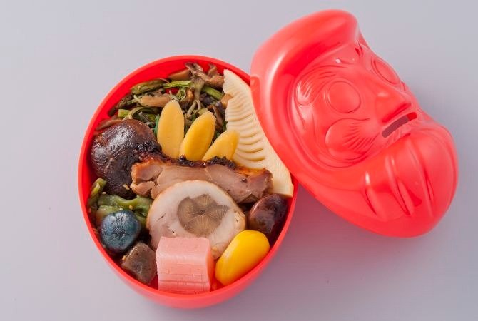 达摩是群马县的象征。这种传统的空心日本人偶以禅宗创始人为原型,代表着好运。达摩便当内装满了米饭、鸡肉和群马当地的蔬菜。吃完便当后,便当盒可以作为存钱罐使用。