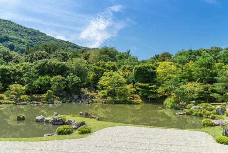 在某个特定的造景中,您经常会在背景中看到一座山,以突出庭园的特征。天龙寺的庭园就很好地利用了这种视觉效果,庭园四周环绕着龟山和岚山山麓的美景。参观日式庭园时,不仅要着眼于眼前的事物,还要关注与庭园融为一体的周边风景。
