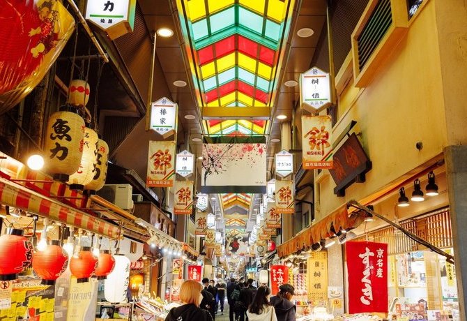 对美食爱好者来说,任何地方都比不上锦市场。锦市场又被称为“京都的厨房”。您会发现,这条长 400 米的狭窄巷道里有形形色色的商家,售卖从豆腐甜甜圈和鹌鹑蛋到高级瓷器与厨具等各种商品。尽管高峰时期人潮拥挤,锦市场还是持续吸引着当地人前往。