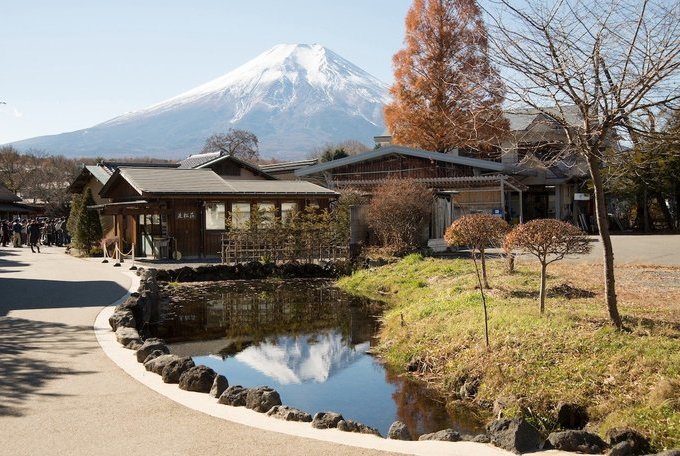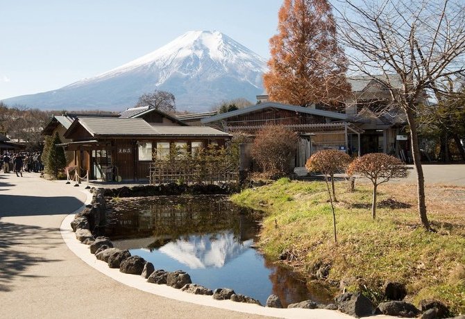 - 在忍野八海传统茅屋的环绕下,享受完美的富士山美景