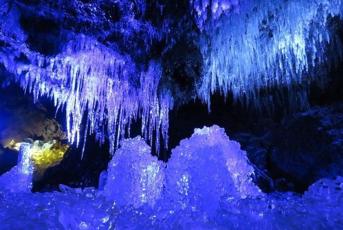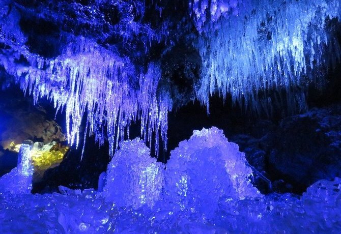 在青木原的西湖一侧,有三个内部已铺设步道和阶梯的洞穴,游客无需特殊装备和向导,就能入内参观。除了较大的西湖蝙蝠洞外,鸣泽冰穴和富岳风穴也都值得一游。从初冬到仲春,鸣泽冰穴内会凝结出巨大的冰柱。数百年前,富岳风穴曾用来存放冰块,供当地使用。步行约 15 分钟即可抵达富岳风穴,这里的特色是同样迷人的冰池。