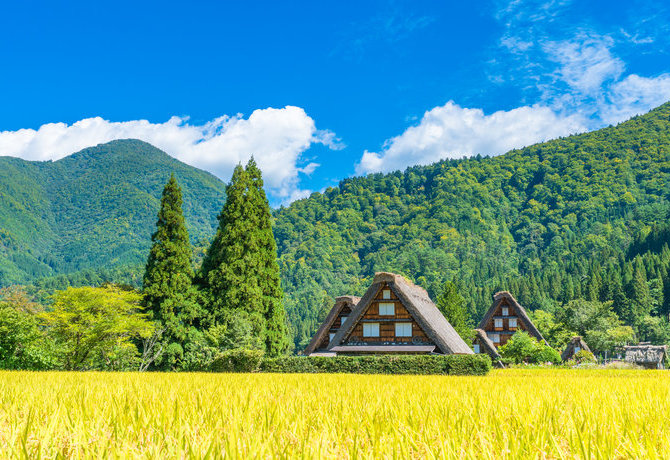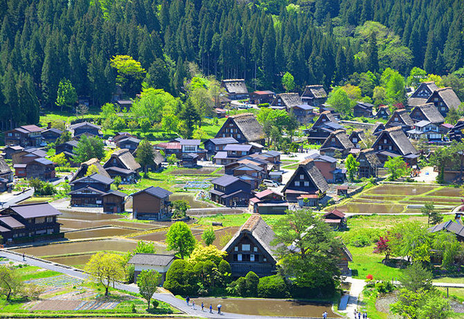 约 30 间保存良好的合掌造(即陡峭的茅草屋顶)房舍分布在一座池塘周围,看起来就像童话中的场景一样。其中有多间对外开放。