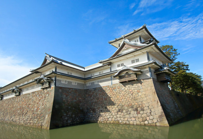 金泽城就在兼六园旁边。原始的金泽城建于 16 世纪下半叶,目前仍在进行的是该城堡的重建工程。藉由金泽城的庞大建筑与优雅庭园,不难想象过去统治此地区的前田氏一定极为富有。
