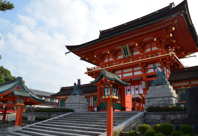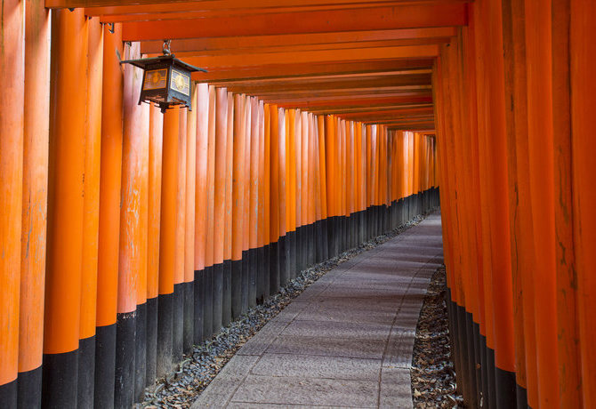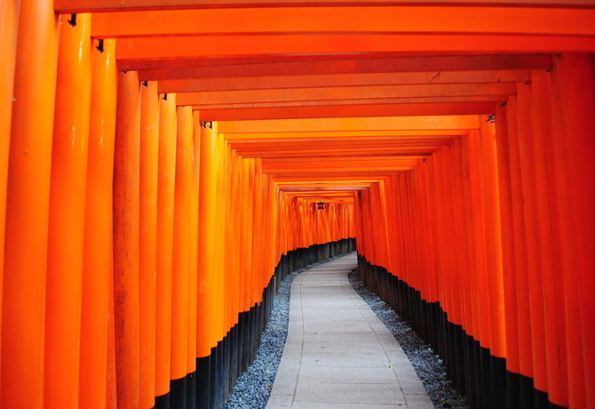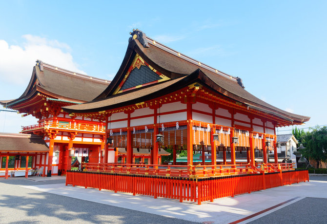 伏见稻荷大社位于京都站南边,这是一个以清酒酿造厂闻名的地区。宁静的神社腹地由名为稻荷 (Inari) 的狐神守护,吸引着游客前来参观。红色的鸟居形成隧道,通往正殿后方的森林。若想多伸展下筋骨,可以沿着木制步道继续往上走,到达海拔 233 米高的稻荷山。