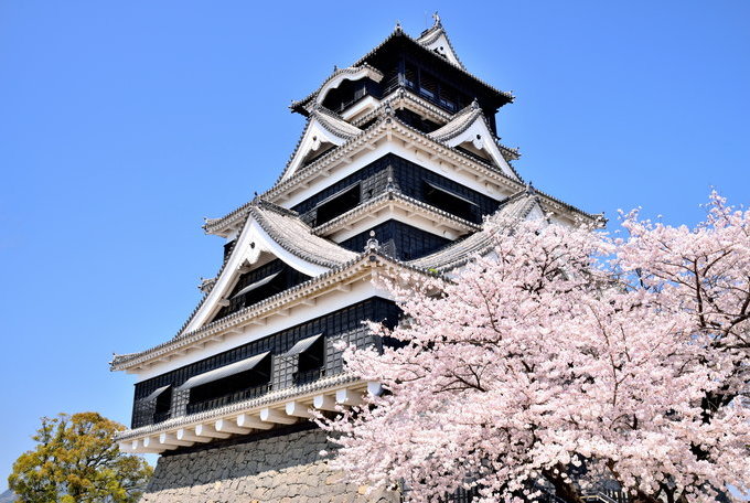 熊本市是宏伟的熊本城所在地。尽管熊本城在 2016 年的熊本地震中受损,但这座黑色的城堡依然是熊本市庄严雄伟的象征。城堡周围有 800 多棵樱花树,是绝佳的赏樱地点。