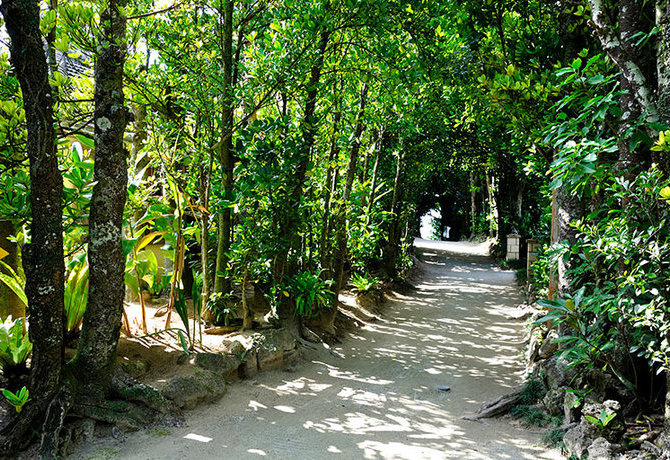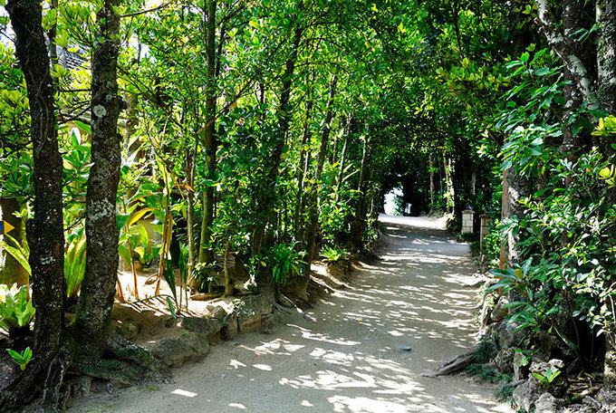 美丽海水族馆的北边是依然保留着原貌的传统冲绳民居。在为了防止房屋受暴风雨破坏而栽种的福木(藤黄属树木)之间漫步。这些树木沿着道路两旁排列,绵延约 1 公里,是冲绳独有的景点。