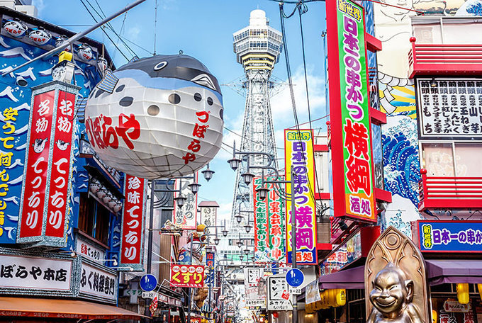 您可以在新世界一带享用晚餐。这里亦有大阪的经典地标——通天阁。新世界集复古商店、剧院与餐厅于一体,但大多数游客都是为了美食而来,因为这里的炸串远近闻名。炸串是一种将肉类、蔬菜串起,以高温炸熟的小吃。通天阁和新世界是大阪的必去之地,在这里就可以逛上好几个小时。