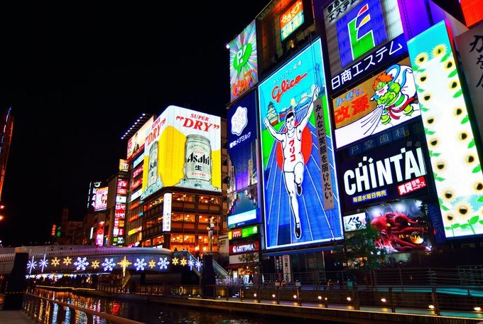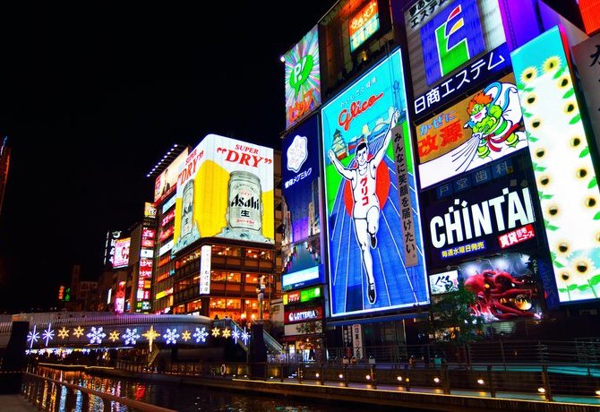 道顿堀川和道顿堀一带可谓南街的核心。道顿堀桥连接心斋桥筋和戎桥筋,当夜幕降临时,河畔的大楼霓虹闪烁,十分迷人。在这些复古未来主义风格的景色中,最知名的莫过于跑跑人招牌了。雷利·史考特 1980 年代的好莱坞惊悚片《黑雨》就曾引用过这一角色。