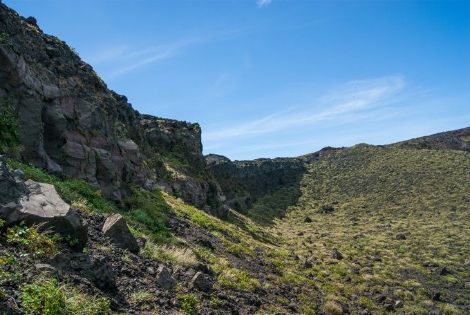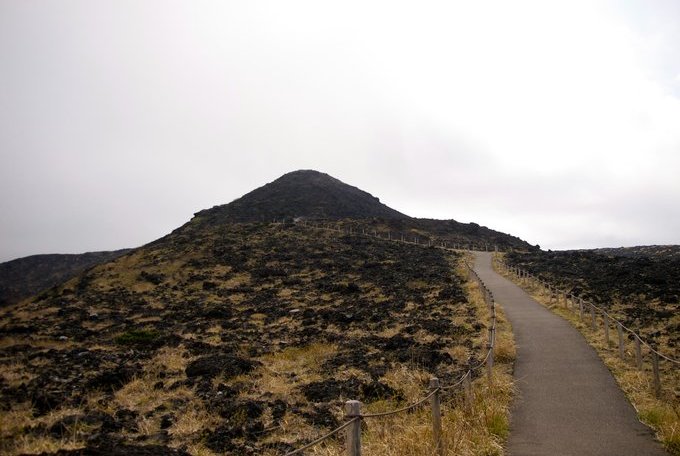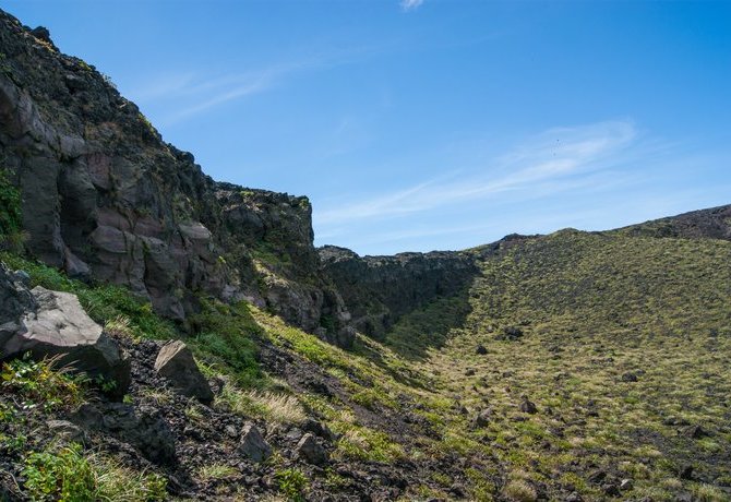 名为 Ohachi-meguri 路线的山顶步道环绕着直径约 300 米的火山口,沿着步道,仔细观察火山口里的红棕色沉积物。