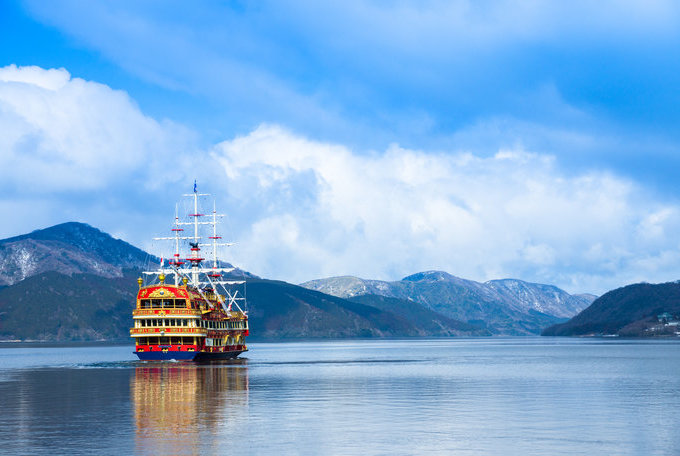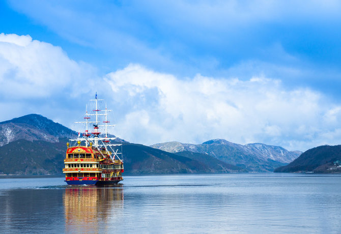 空中缆车的终点站是芦之湖。在芦之湖搭乘横渡湖区的“海盗”观光船,搭上这艘色彩缤纷的古典观光船,欣赏富士山与周围地区的优美景色。