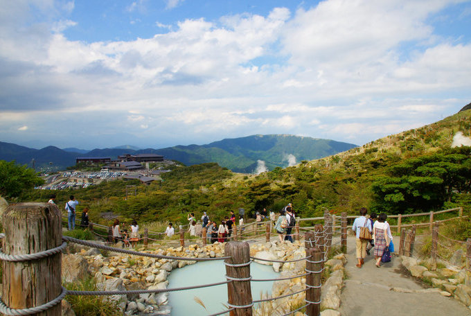 在空中缆车的中途下车,您可以参观火山区域的天然地热温泉,购买被温泉染黑的知名箱根黑蛋。不过请注意:有呼吸系统疾病的游客请勿前往大涌谷,因为硫磺气体在某些日子里可能会很刺鼻。