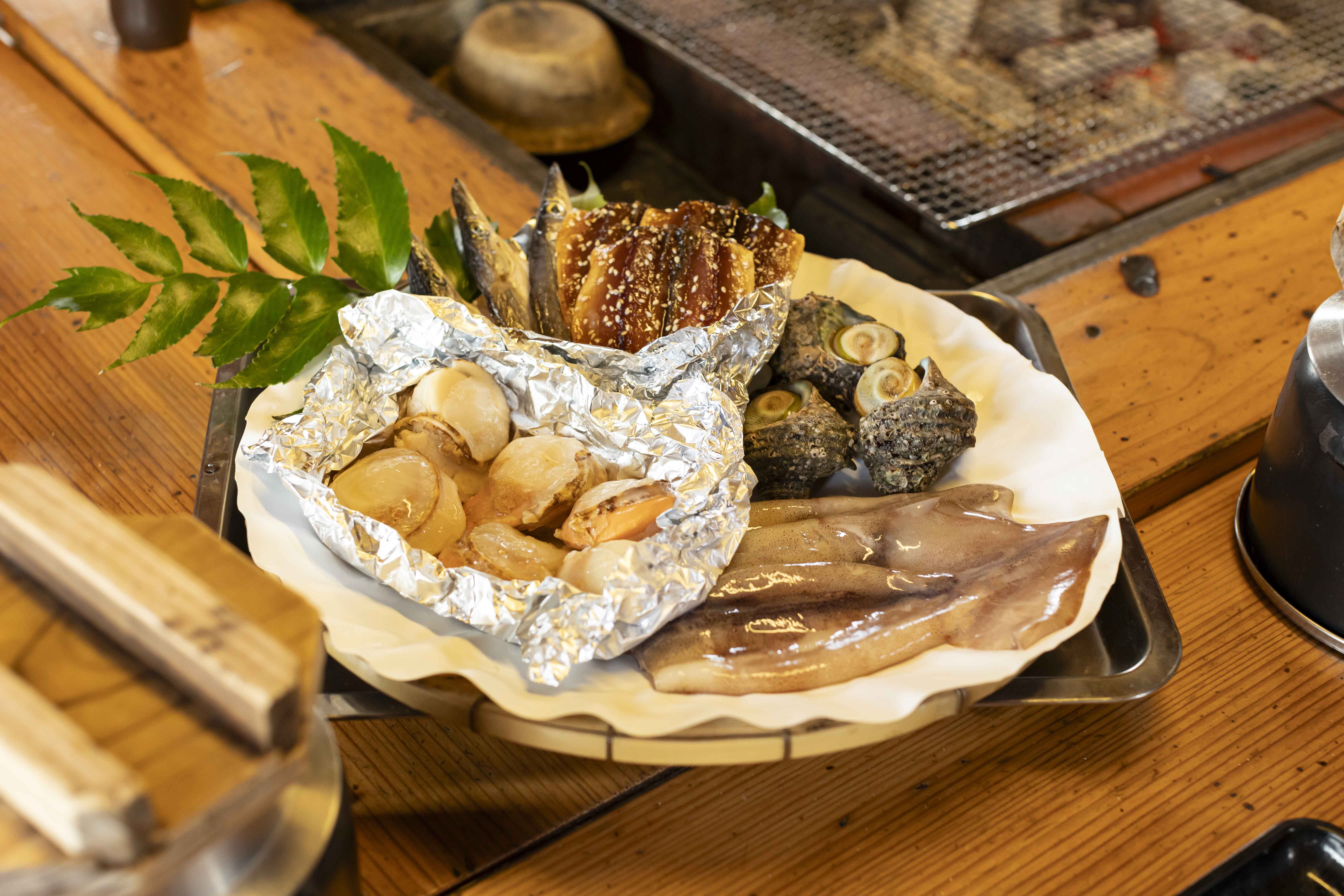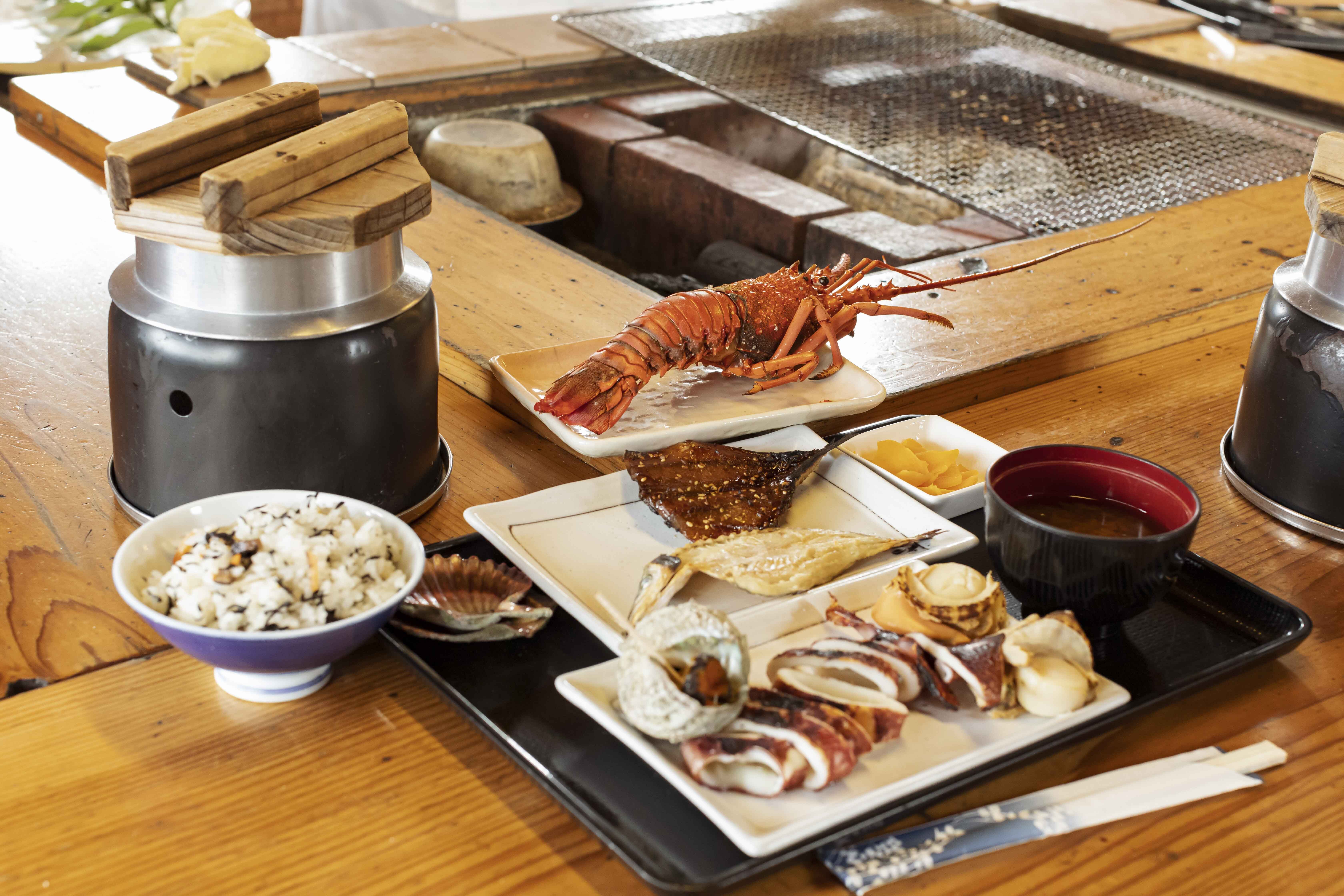 烤制好的伊势龙虾等海鲜配以羊栖菜釜饭、当地特产青海苔味噌汤