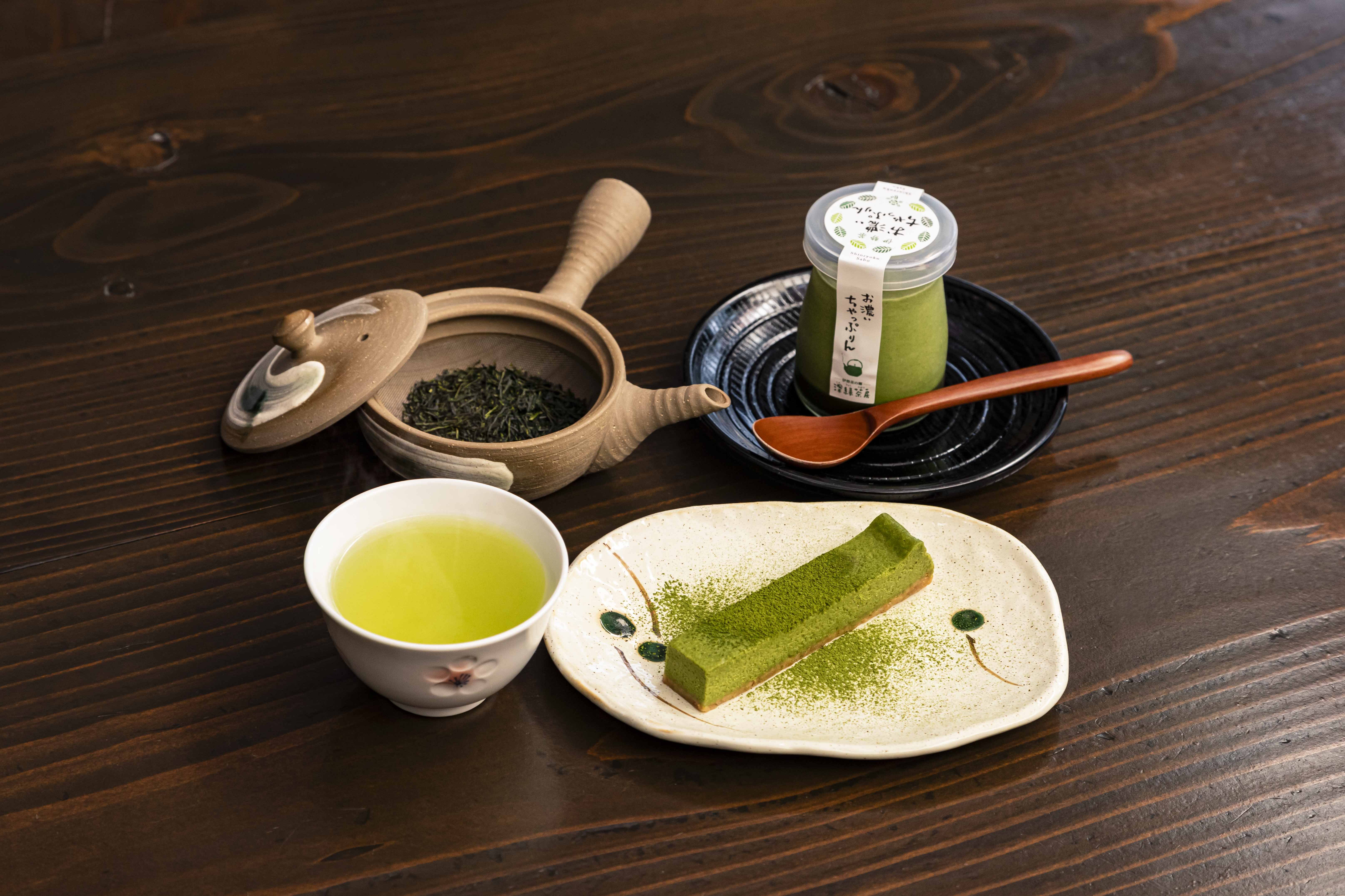 在令人心绪宁静的空间里,品味煎茶与抹茶甜品(抹茶芝士蛋糕与布丁)