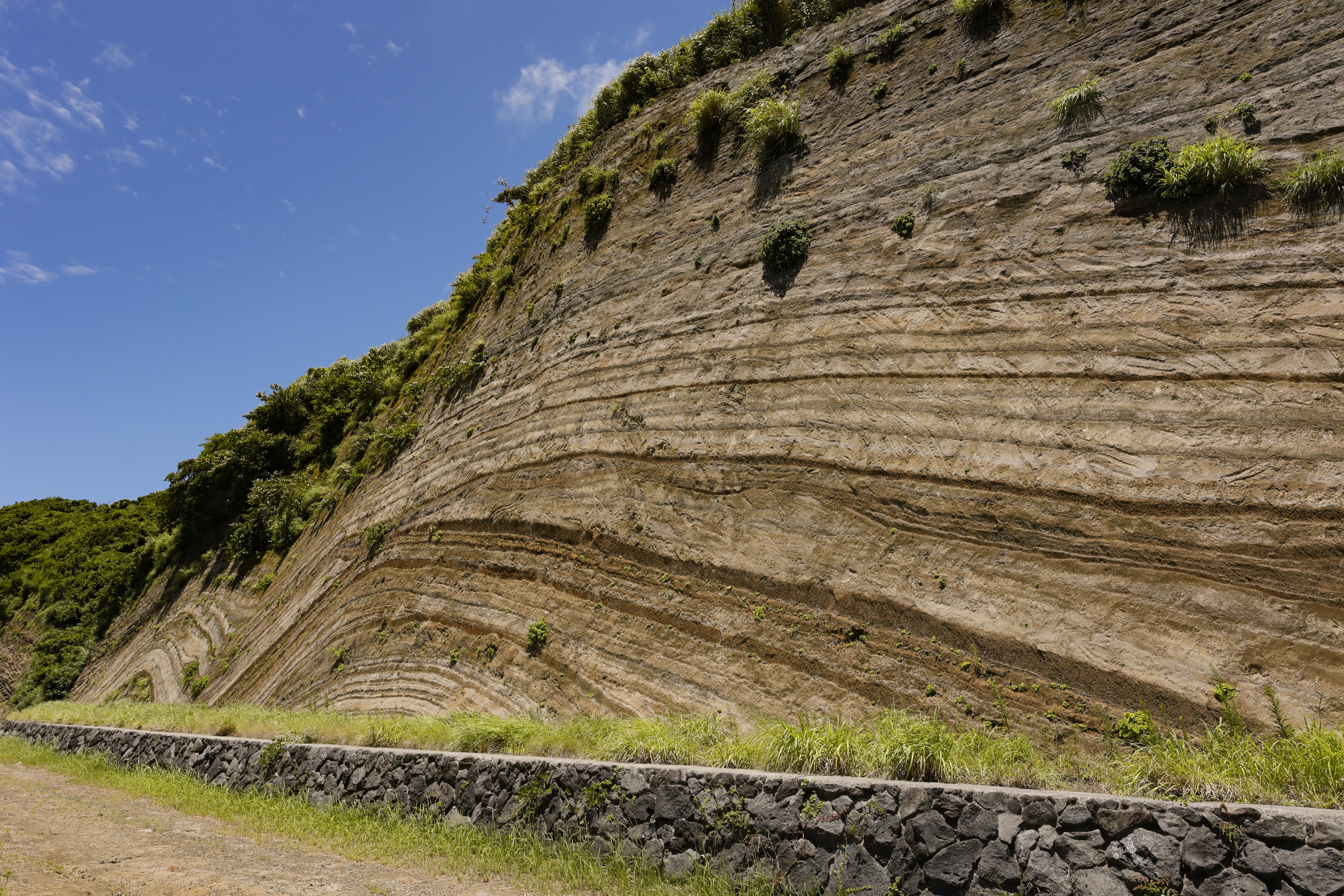 沿着环绕三原山山麓的道路前行,便会邂逅仿佛截取了地球记忆般的壮丽景色。那就是岛内广为人知的名胜“地层大切面”——俗称“年轮蛋糕”。