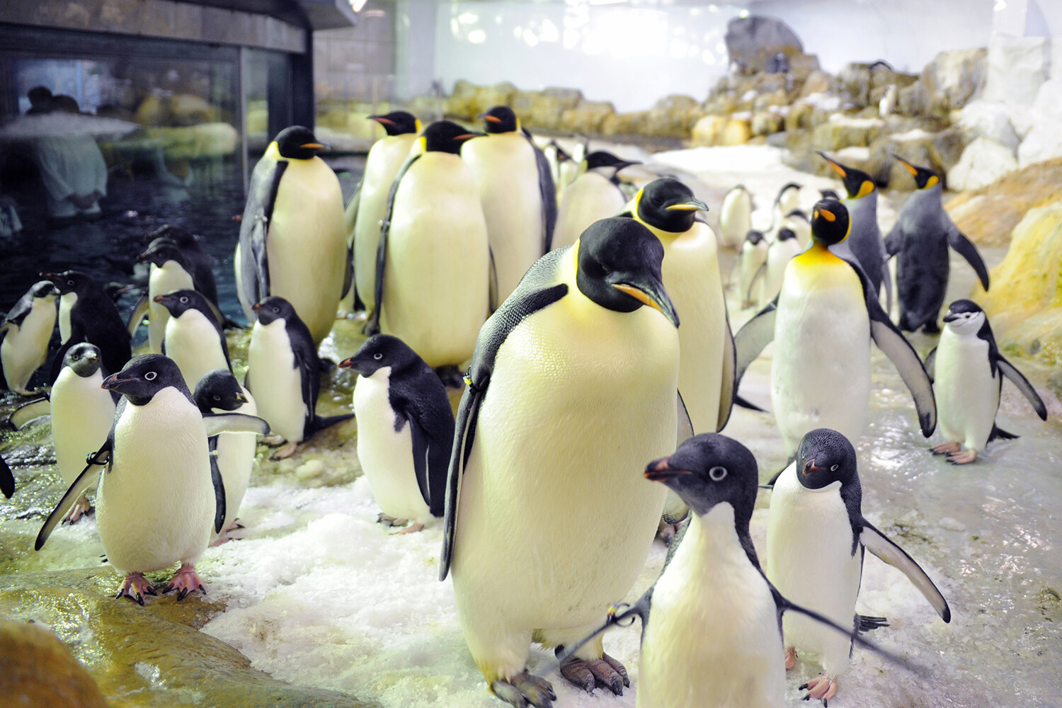 园内栖息着八个品种约 500 只企鹅,堪称日本规模最大的企鹅群落之一,令园区引以为傲。作为日本仅有的两家、全球为数不多成功繁育极度珍稀帝企鹅的机构之一,冒险大世界彰显了其独树一帜的专业造诣。2025 年 9 月,园区喜迎四年来首只帝企鹅幼崽降生,如今这只萌态十足的小家伙已在公众展区与游客见面。